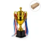 Elegant small cup trophy crafted from durable ABS plastic, with premium metallic plating and a gold-tinted lacquer for a refined finish. Featuring a classic closed cup design with decorative two-sided leaf handles and mounted on a sturdy black plastic base, this trophy offers a prestigious look at an economical price. The removable ribbon attached to both handles adds a ceremonial touch, making it perfect for sports events, school competitions, corporate recognition, and special award ceremonies.